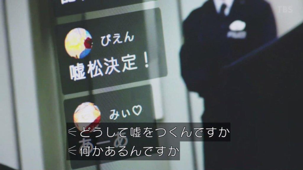 この警察と取材陣のやり取りをみたネット民が『嘘松確定!』とTwitterのようなものでつぶやき、そのコメントが画面にアップで映されました。